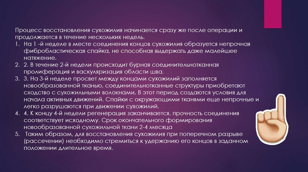 Процесс восстановления сухожилия начинается сразу же после операции ипродолжается в течение нескольких недель.