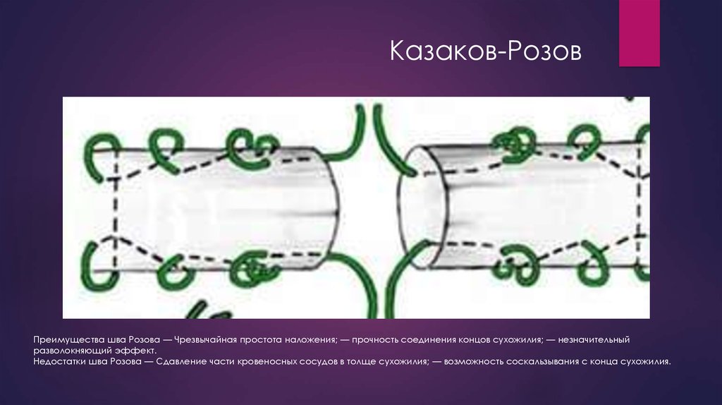 Казаков-РозовПреимущества шва Розова — Чрезвычайная простота наложения; — прочность соединения концов сухожилия; — незначительный