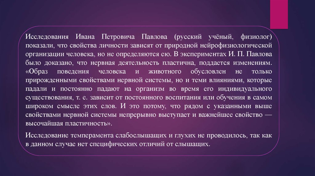 Исследования Ивана Петровича Павлова (русский учёный, физиолог)показали, что свойства личности зависят от природной нейрофизиологической