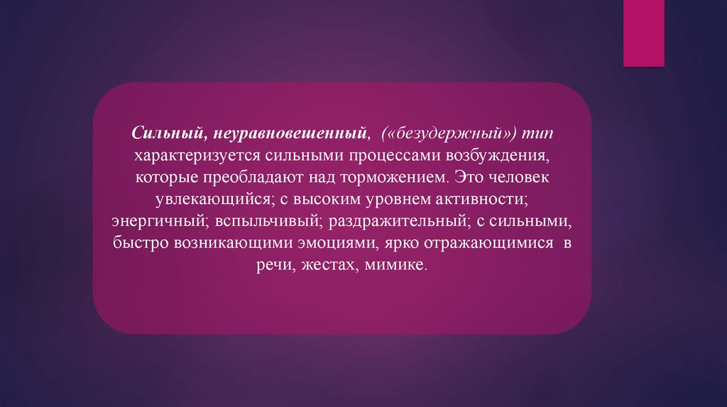 Сильный, неуравновешенный, («безудержный») типхарактеризуется сильными процессами возбуждения,