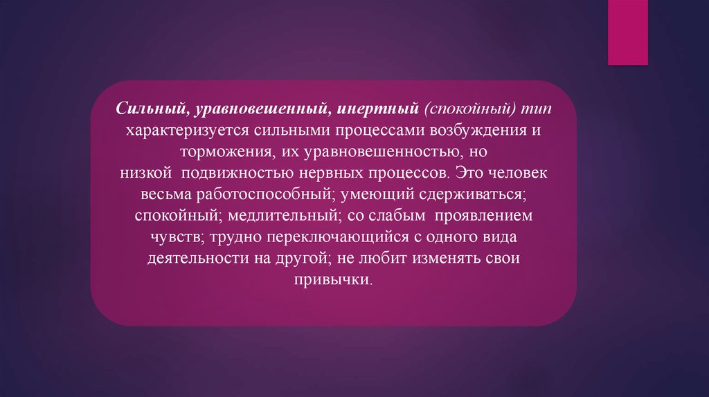 Человек с высокой чувствительностью и малой реактивностью. Повышеннаячувствительность при большой инертности приводит к тому, что