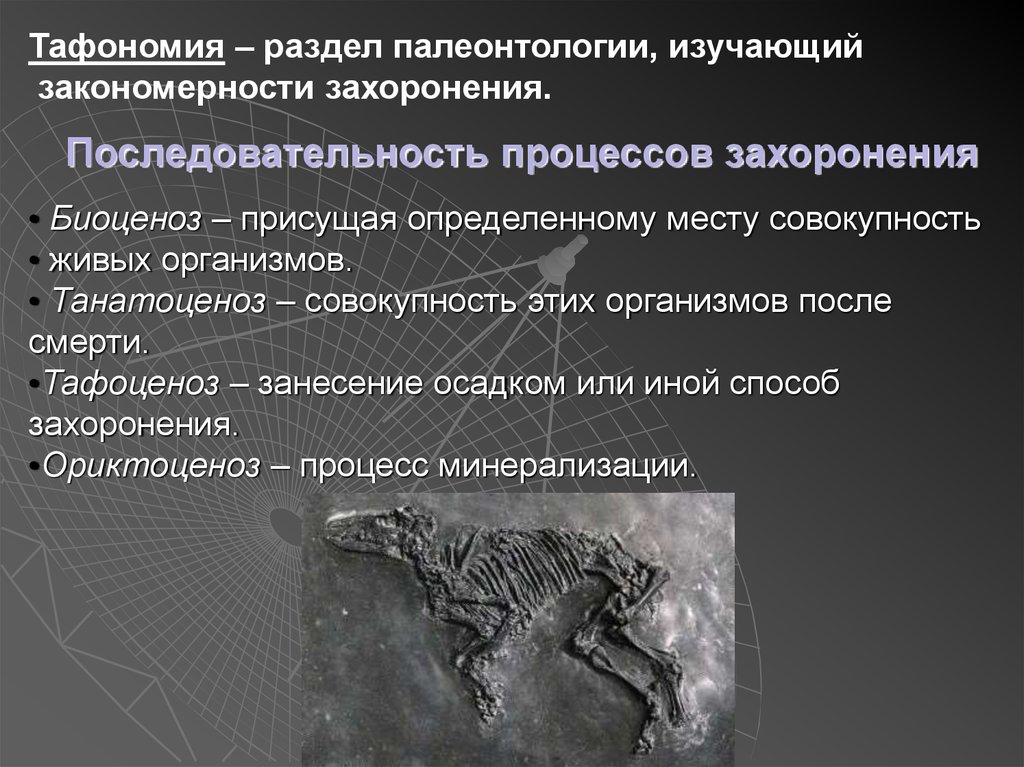 Тафономия – раздел палеонтологии, изучающийзакономерности захоронения.