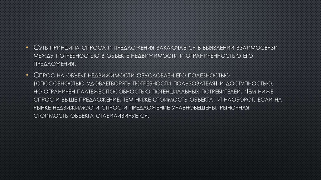 СПРОС И ВЫШЕ ПРЕДЛОЖЕНИЕ, ТЕМ НИЖЕ СТОИМОСТЬ ОБЪЕКТА. И НАОБОРОТ, ЕСЛИ НА