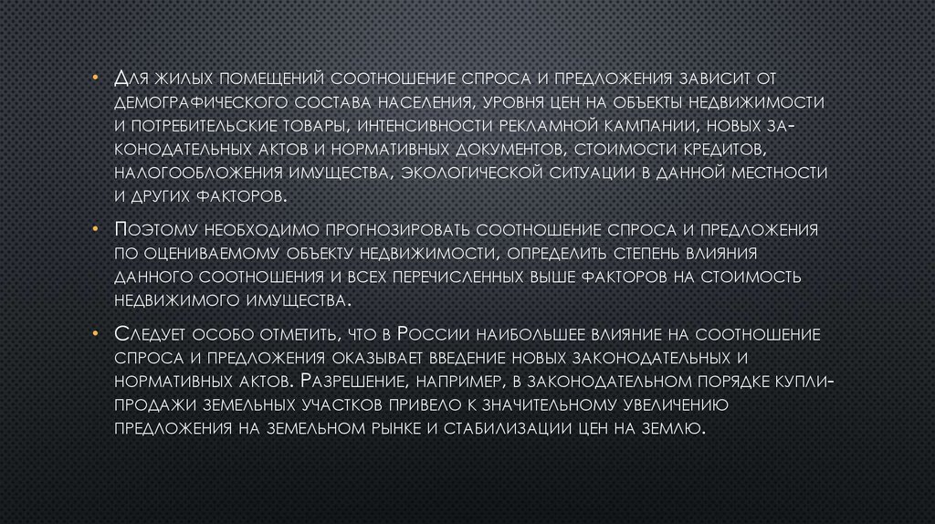 • ДЛЯ ЖИЛЫХ ПОМЕЩЕНИЙ СООТНОШЕНИЕ СПРОСА И ПРЕДЛОЖЕНИЯ ЗАВИСИТ ОТДЕМОГРАФИЧЕСКОГО СОСТАВА НАСЕЛЕНИЯ, УРОВНЯ ЦЕН НА ОБЪЕКТЫ НЕДВИЖИМОСТИ