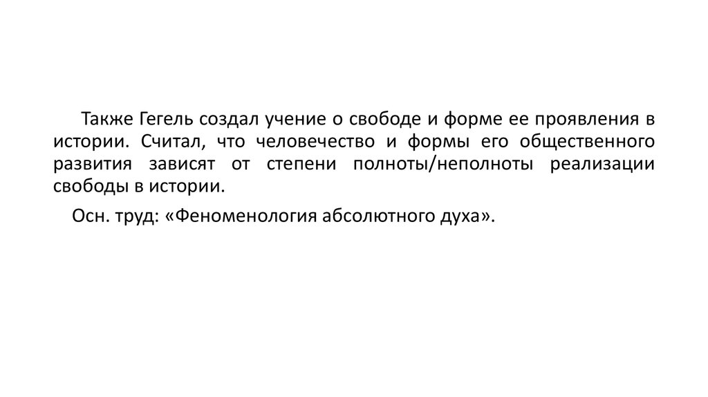 Также Гегель создал учение о свободе и форме ее проявления вистории. Считал, что человечество и формы его общественного