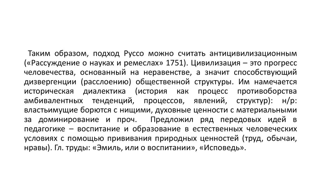Таким образом, подход Руссо можно считать антицивилизационным(«Рассуждение о науках и ремеслах» 1751). Цивилизация – это прогресс