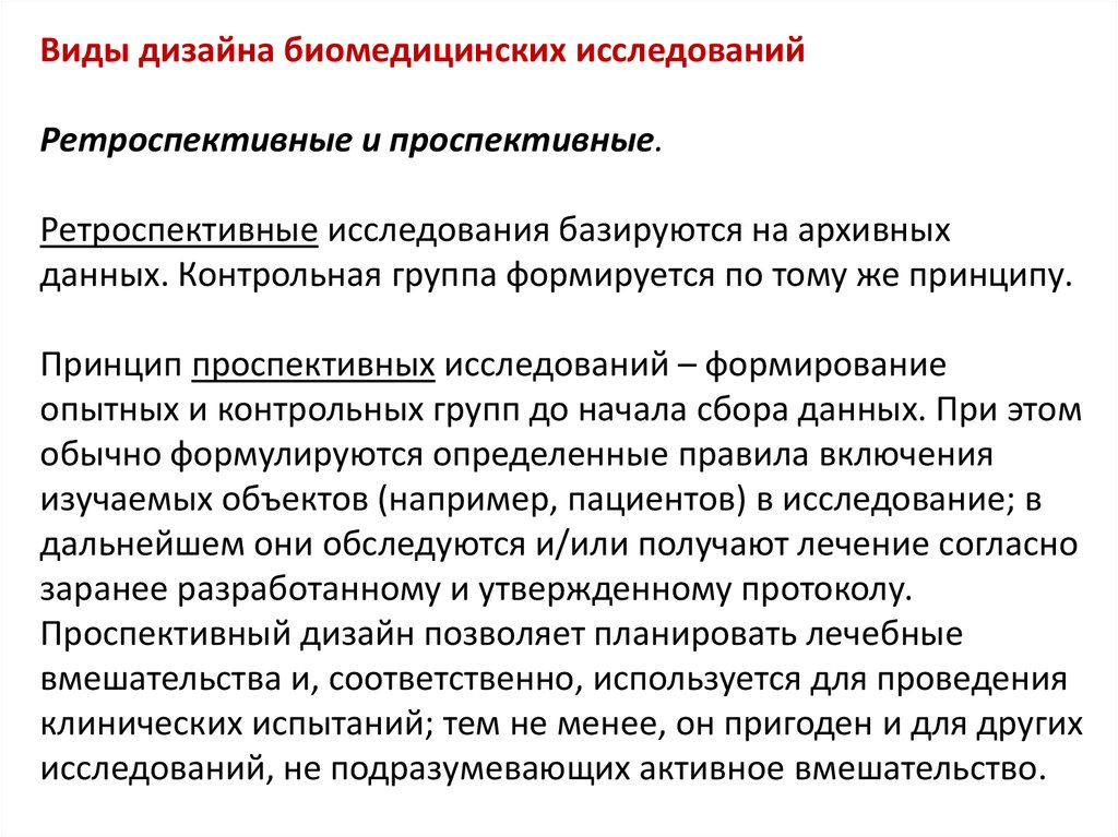 Виды дизайна биомедицинских исследованийРетроспективные и проспективные.
