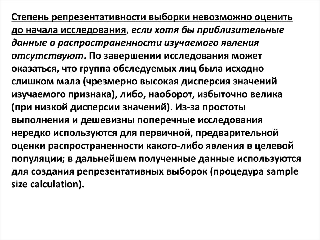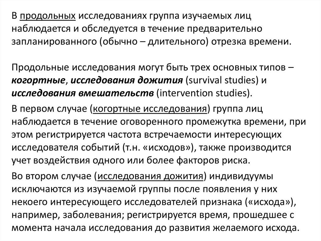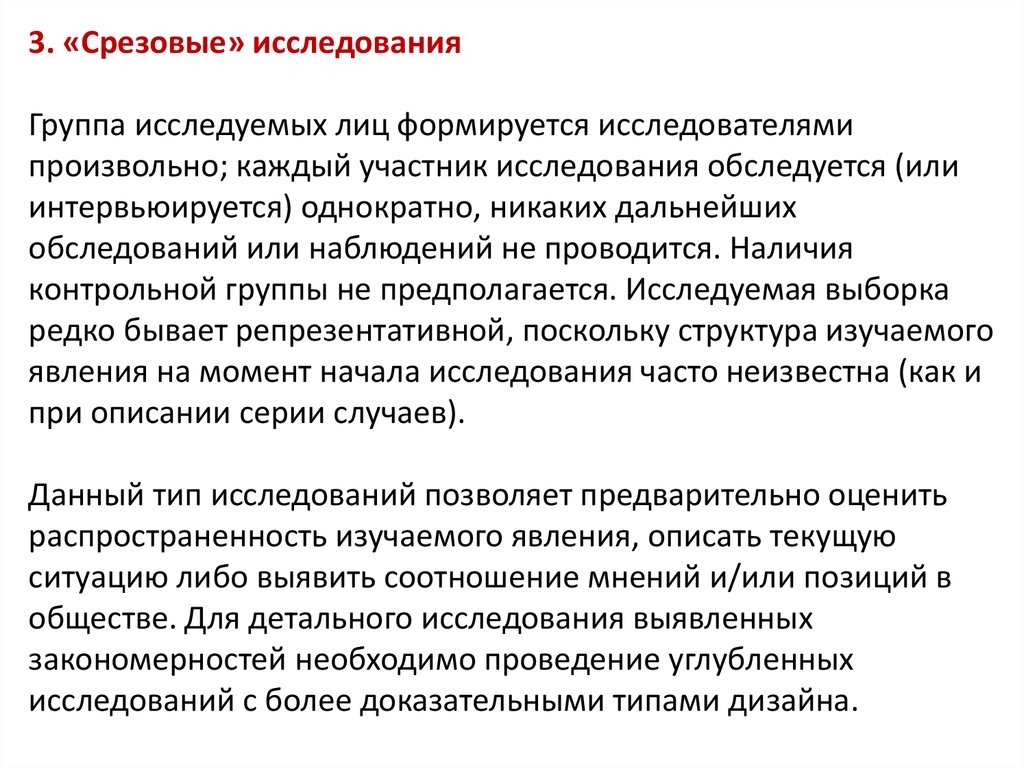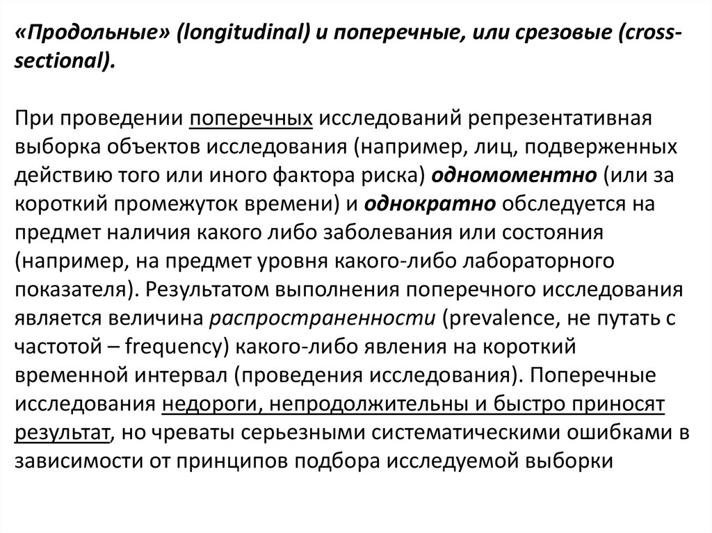 «Продольные» (longitudinal) и поперечные, или срезовые (crosssectional).При проведении поперечных исследований репрезентативная
