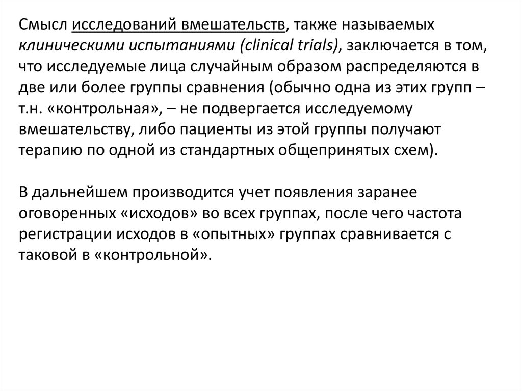 Смысл исследований вмешательств, также называемыхклиническими испытаниями (clinical trials), заключается в том,