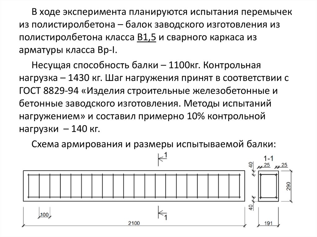 В ходе эксперимента планируются испытания перемычекиз полистиролбетона – балок заводского изготовления из