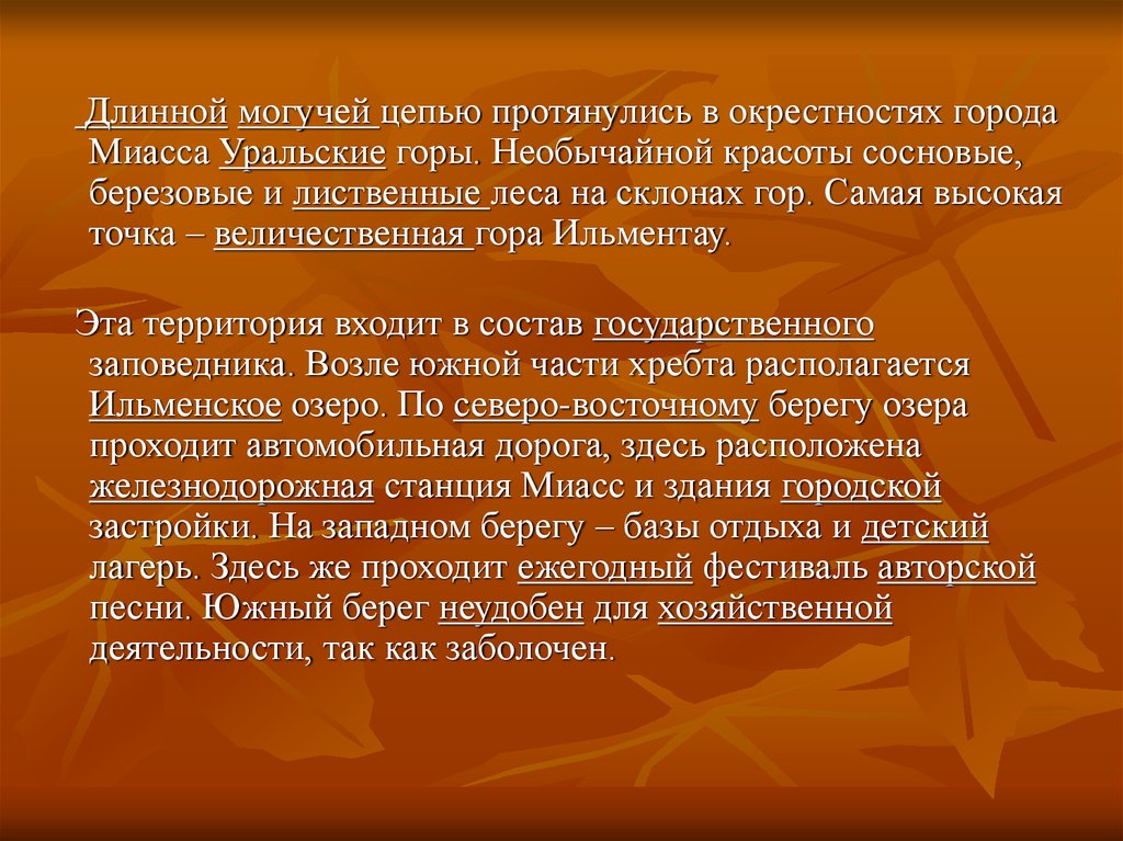 Длинной могучей цепью протянулись в окрестностях городаМиасса Уральские горы. Необычайной красоты сосновые,