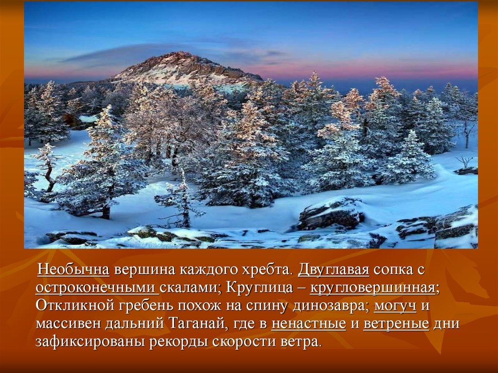Необычна вершина каждого хребта. Двуглавая сопка состроконечными скалами; Круглица – кругловершинная;