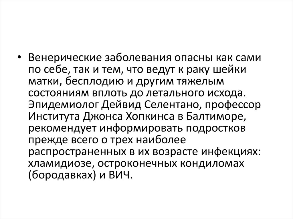• Венерические заболевания опасны как самипо себе, так и тем, что ведут к раку шейки