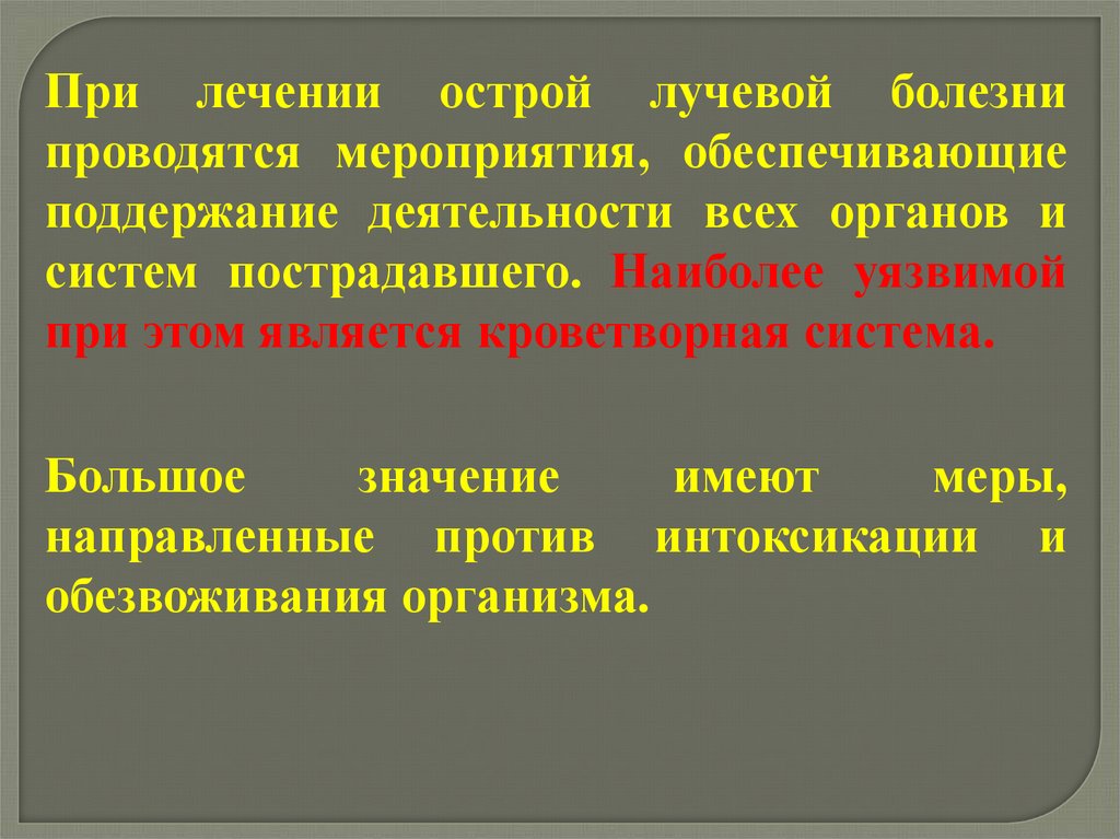 При лечении острой лучевой болезнипроводятся мероприятия, обеспечивающие