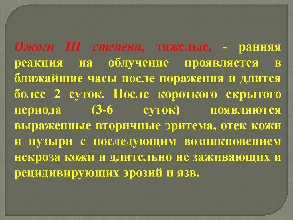 Ожоги III степени, тяжелые, - ранняяреакция на облучение проявляется в