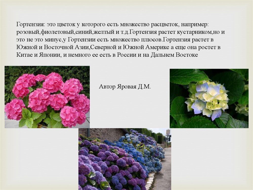 Гортензия: это цветок у которого есть множество расцветок, например:розовый,фиолетовый,синий,желтый и т.д.Гортензия растет кустарником,но и