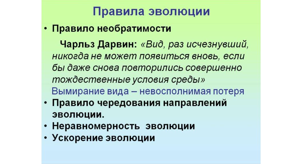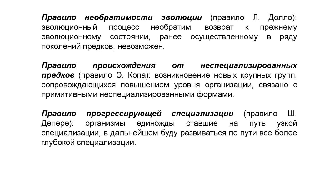 Правило необратимости эволюции (правило Л. Долло):эволюционный процесс необратим, возврат к прежнему