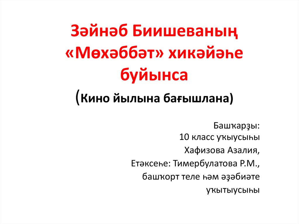 1. Зәйнәб Биишеваның «Мөхәббәт» хикәйәһе буйынса (Кино йылына бағышлана)