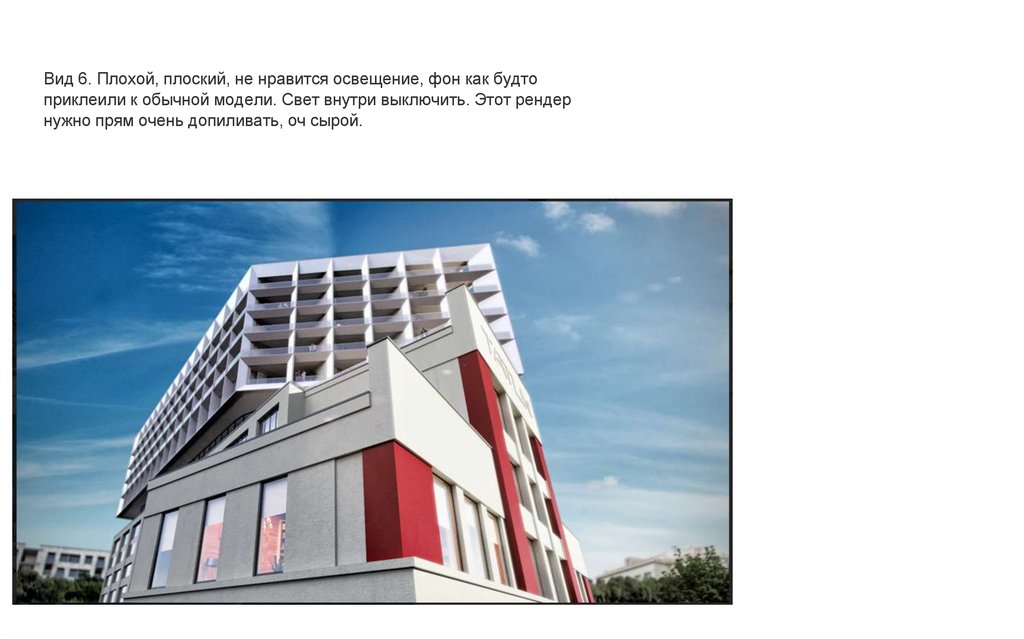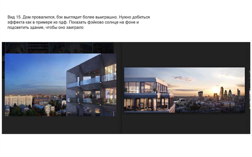 Вид 15. Дом провалился, бэк выглядит более выиграшно. Нужно добитьсяэффекта как в примере из пдф. Показать фэйково солнце на фоне и