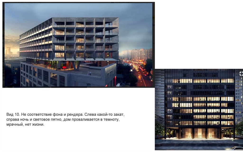 Вид 10. Не соответствие фона и рендера. Слева какой-то закат,справа ночь и световое пятно, дом проваливается в темноту,