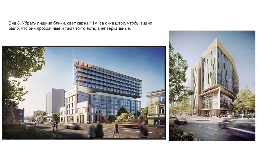 Вид 8. Убрать лишние блики, свет как на 11м, за окна штор, чтобы виднобыло, что они прозрачные и там что-то есть, а не зеркальные.