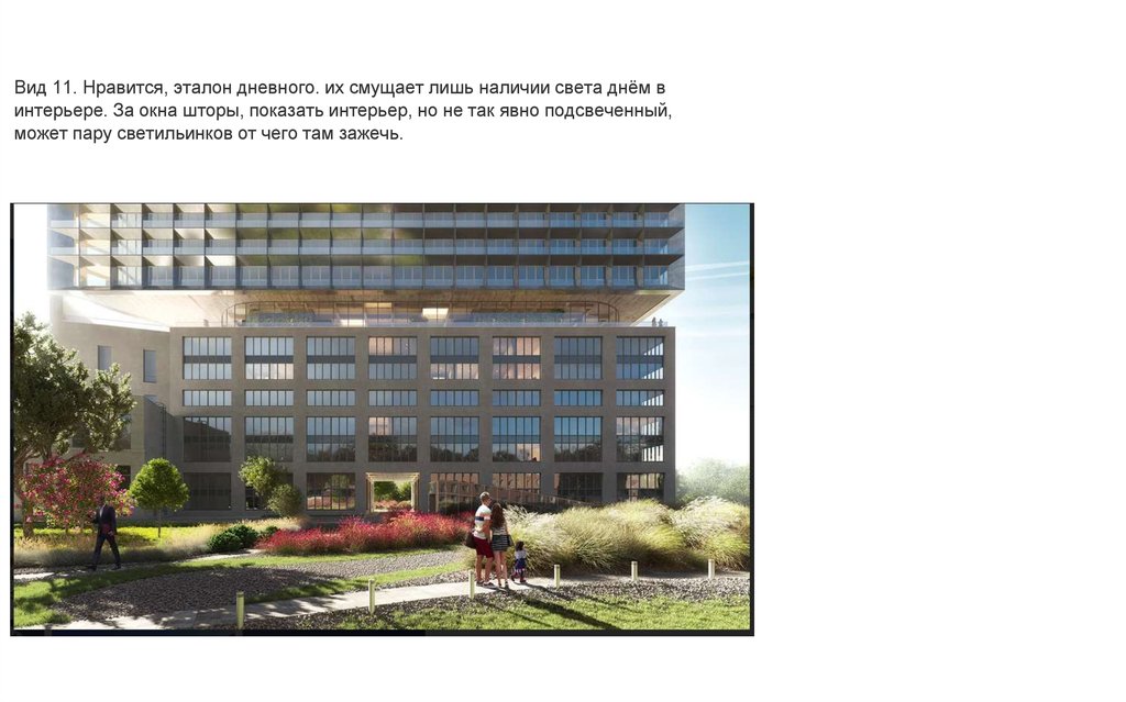 Вид 11. Нравится, эталон дневного. их смущает лишь наличии света днём винтерьере. За окна шторы, показать интерьер, но не так явно подсвеченный,