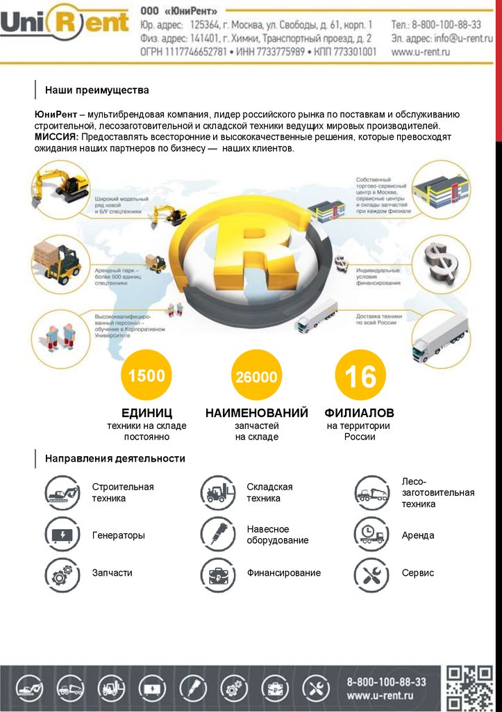 Наши преимуществаЮниРент – мультибрендовая компания, лидер российского рынка по поставкам и обслуживанию