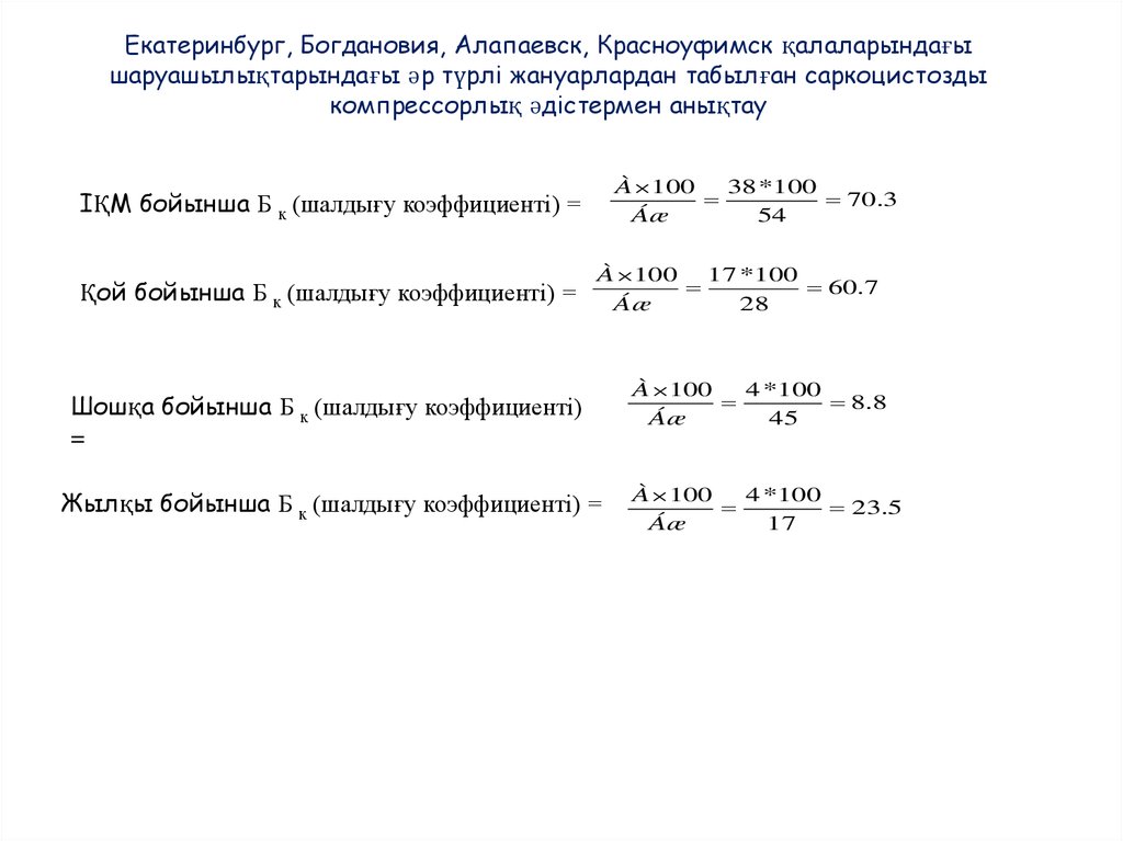 Екатеринбург, Богдановия, Алапаевск, Красноуфимск қалаларындағышаруашылықтарындағы әр түрлі жануарлардан табылған саркоцистозды