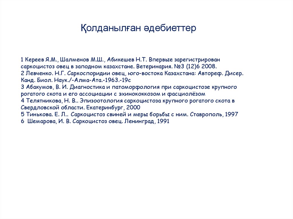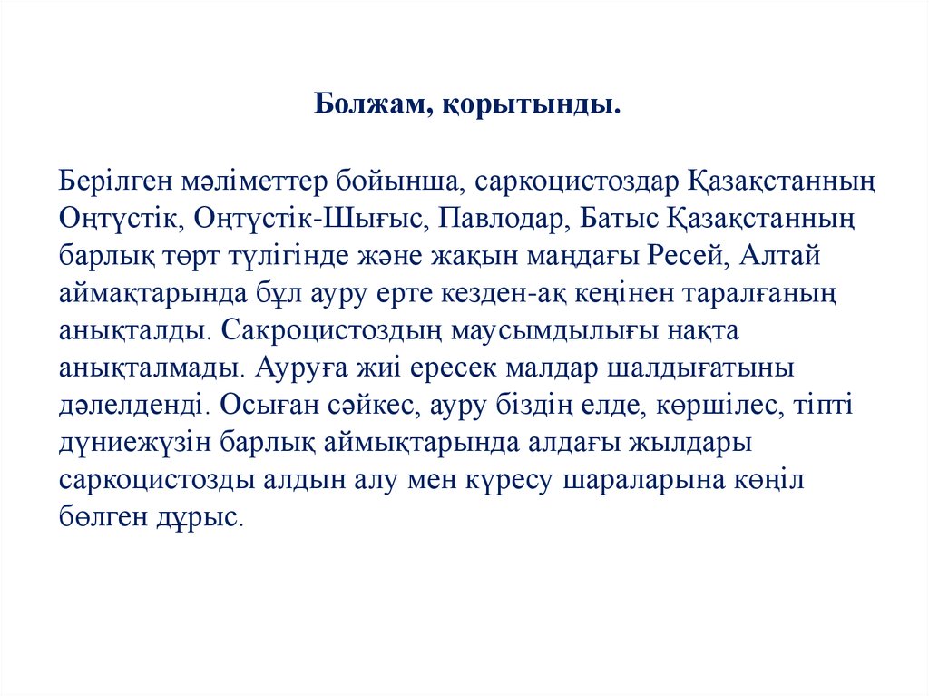 Болжам, қорытынды.Берілген мәліметтер бойынша, саркоцистоздар Қазақстанның