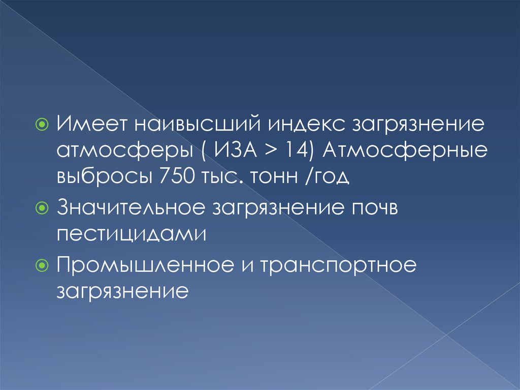 Имеет наивысший индекс загрязнениеатмосферы ( ИЗА > 14) Атмосферные