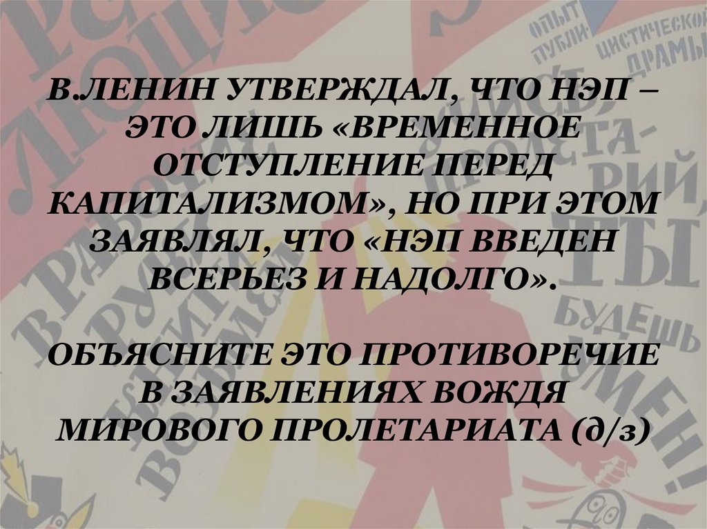 1. В.ЛЕНИН УТВЕРЖДАЛ, ЧТО НЭП – ЭТО ЛИШЬ «ВРЕМЕННОЕ ОТСТУПЛЕНИЕ ПЕРЕД КАПИТАЛИЗМОМ», НО ПРИ ЭТОМ ЗАЯВЛЯЛ, ЧТО «НЭП ВВЕДЕН ВСЕРЬЕЗ