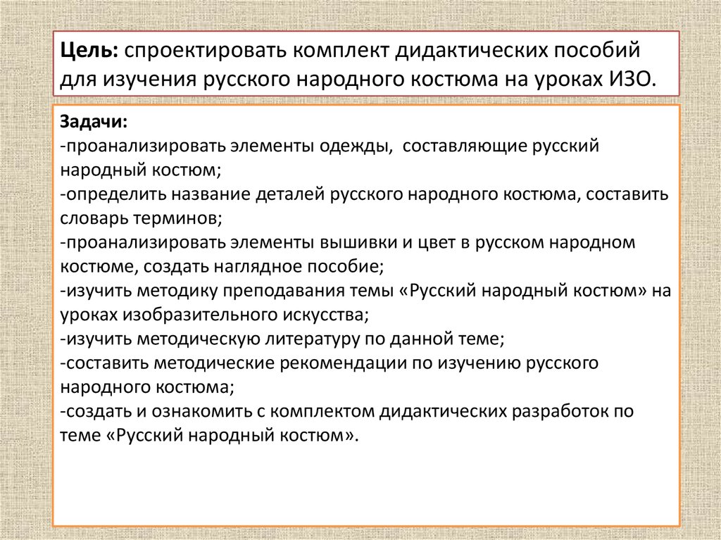 Цель: спроектировать комплект дидактических пособийдля изучения русского народного костюма на уроках ИЗО.
