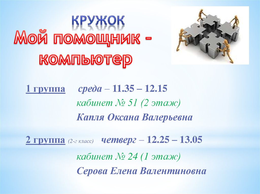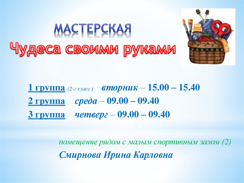 1 группа (2-г класс ) вторник – 15.00 – 15.402 группа среда – 09.00 – 09.40