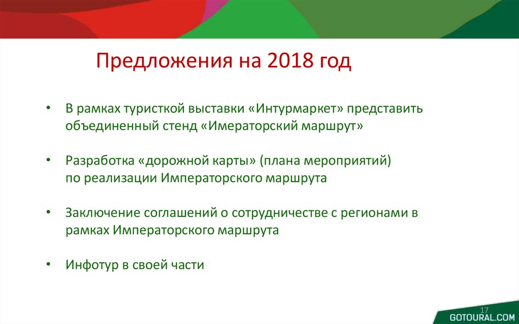 Предложения на 2018 год• В рамках туристкой выставки «Интурмаркет» представить