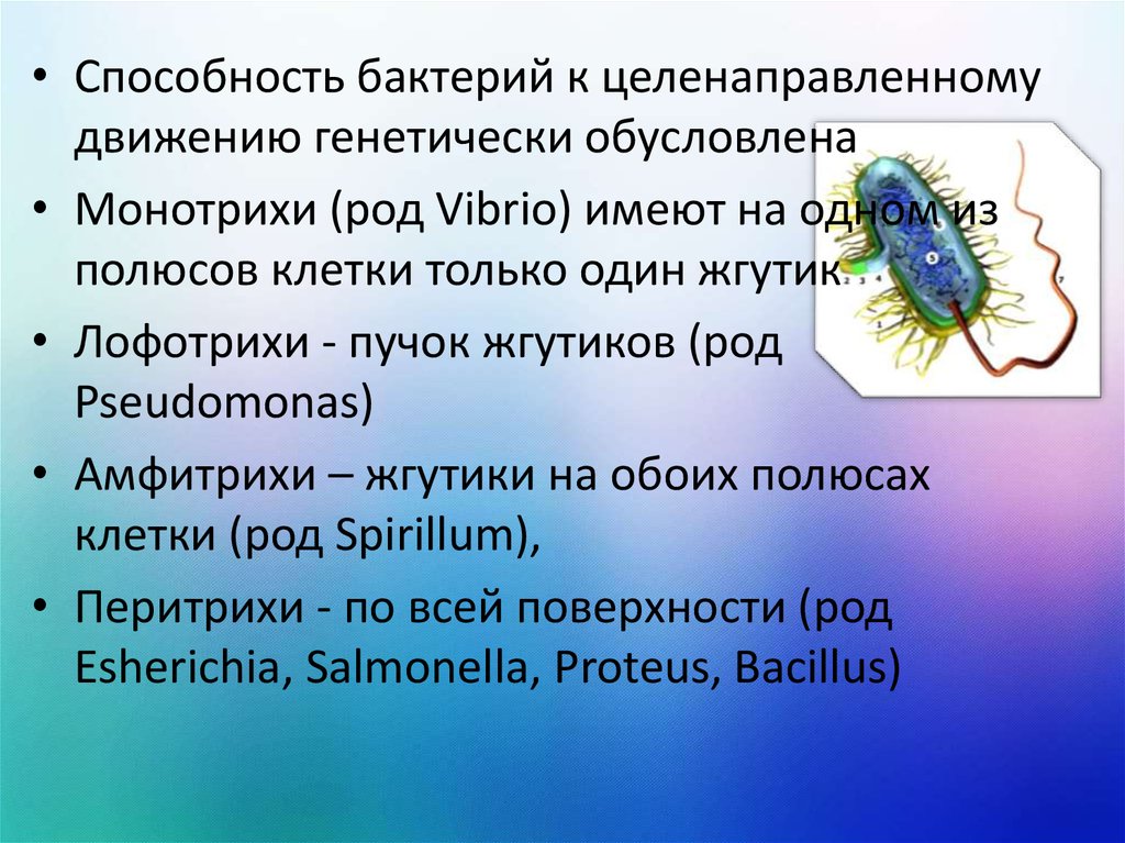 • Способность бактерий к целенаправленномудвижению генетически обусловлена