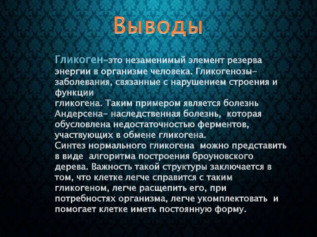 Гликоген-это незаменимый элемент резерваэнергии в организме человека. Гликогенозызаболевания, связанные с нарушением строения и