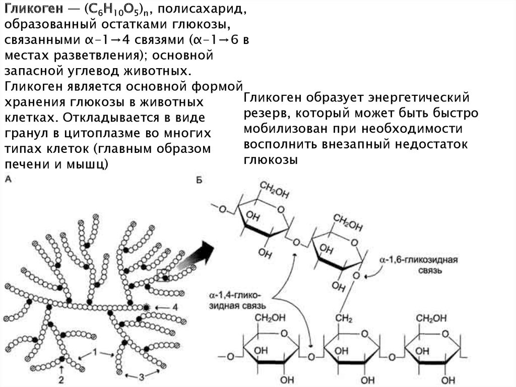 Гликоген — (C6H10O5)n, полисахарид,образованный остатками глюкозы,