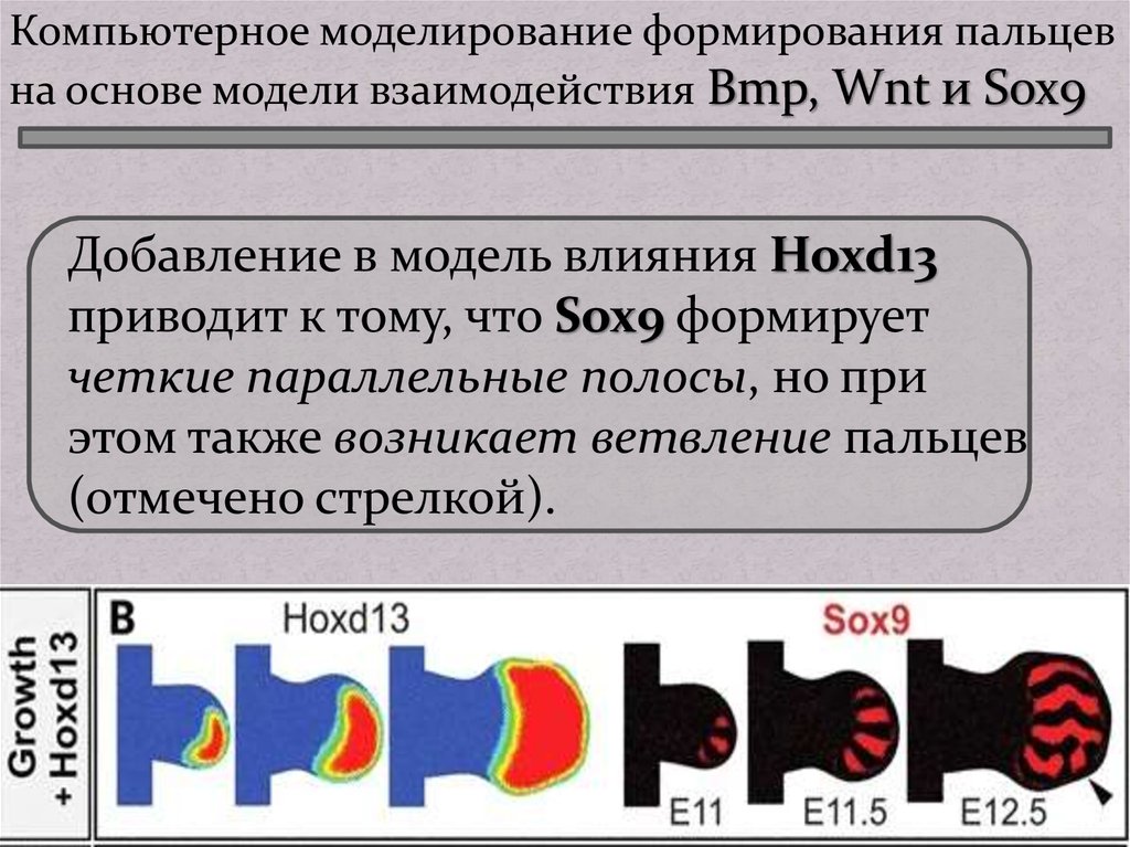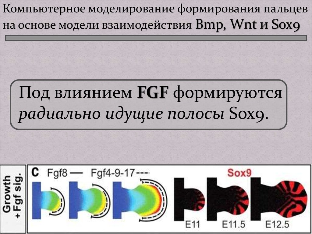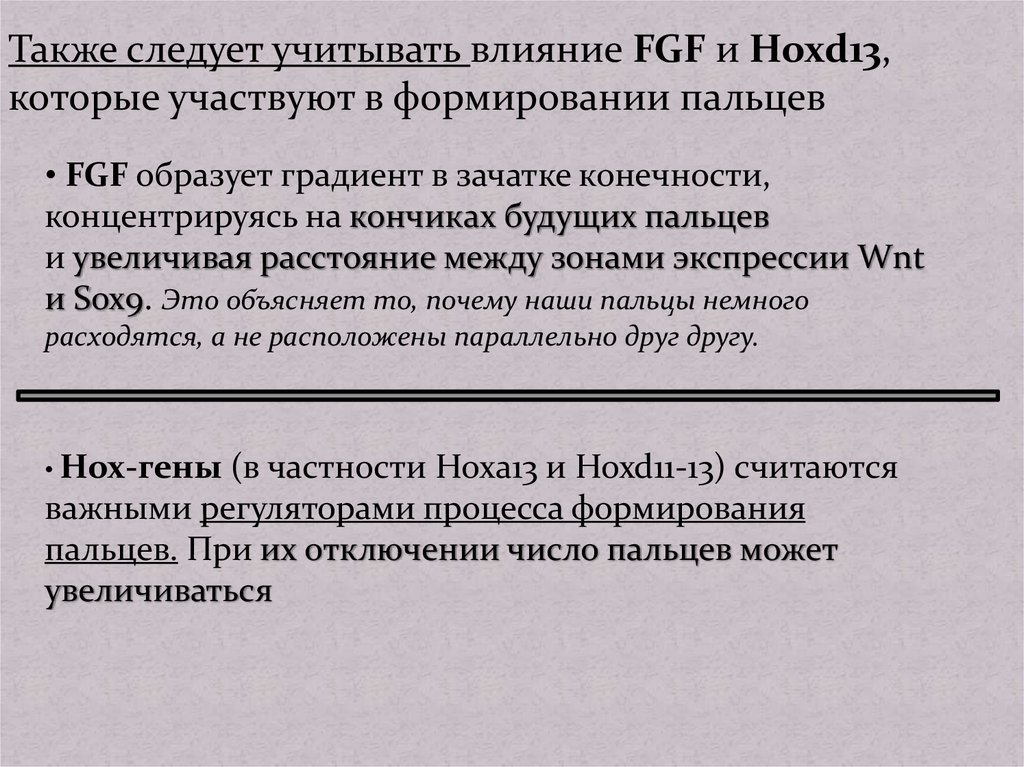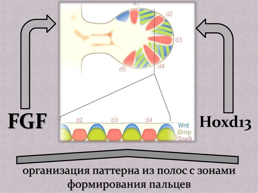 Также следует учитывать влияние FGF и Hoxd13,которые участвуют в формировании пальцев