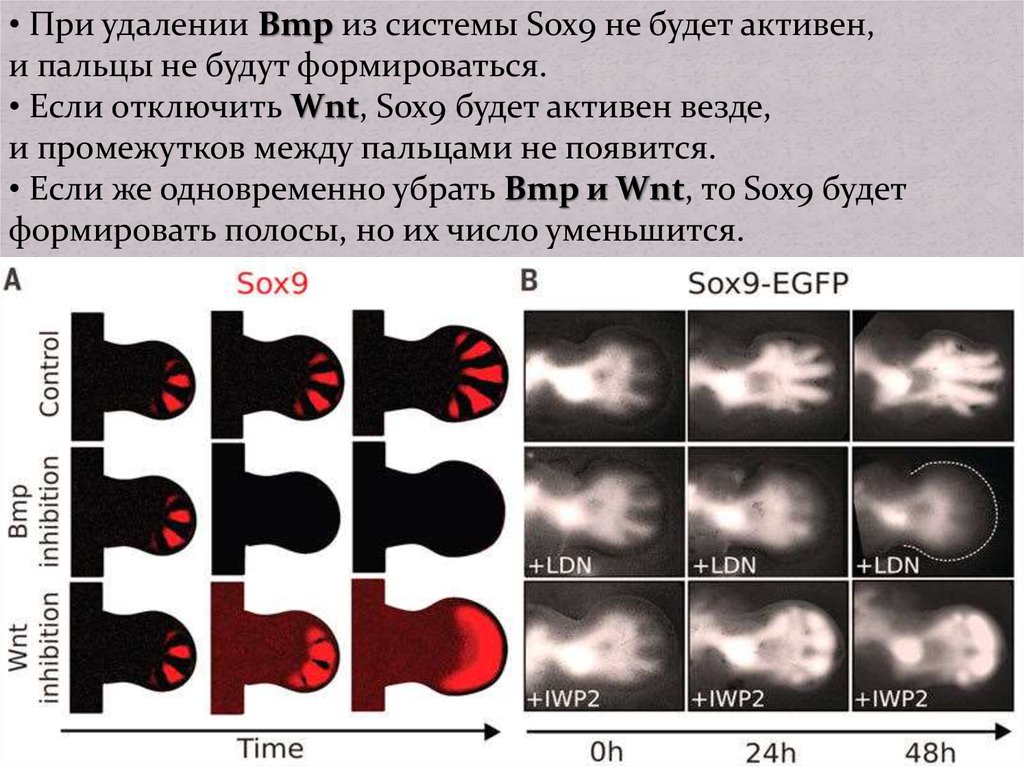 • При удалении Bmp из системы Sox9 не будет активен,и пальцы не будут формироваться.