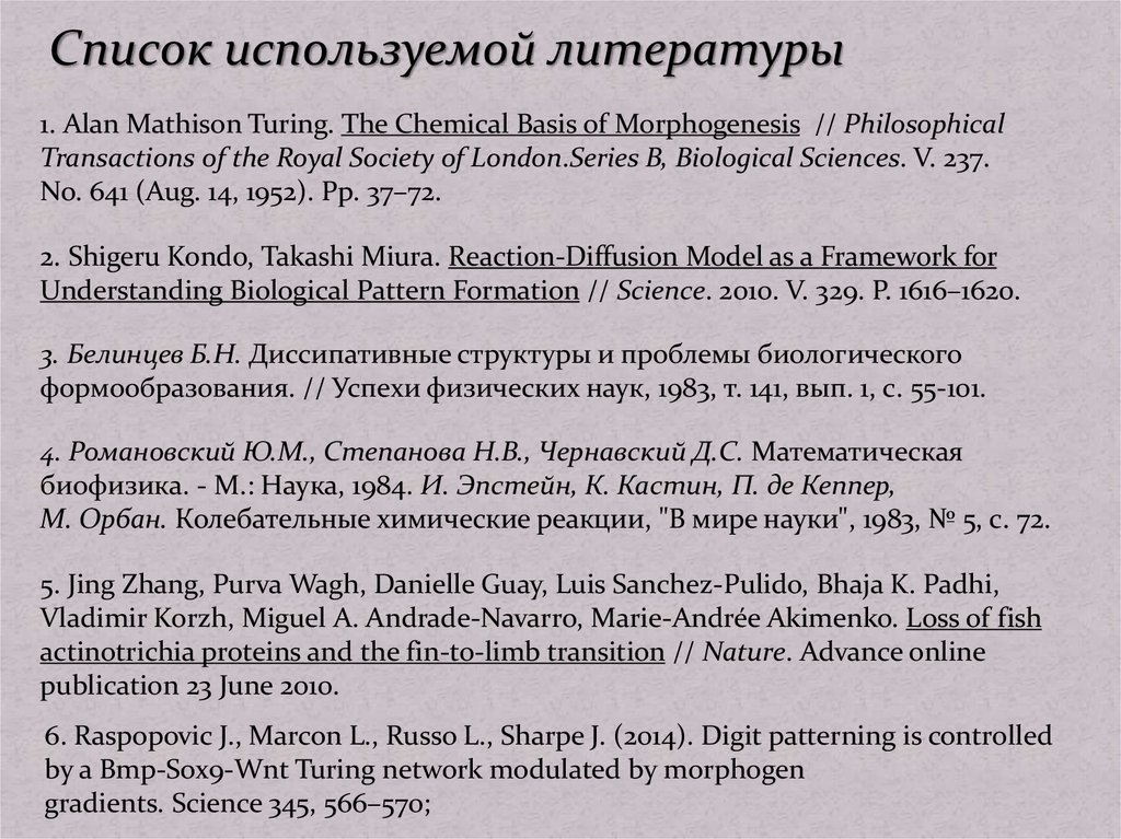 Список используемой литературы1. Alan Mathison Turing. The Chemical Basis of Morphogenesis // Philosophical