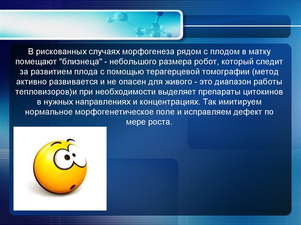 В рискованных случаях морфогенеза рядом с плодом в маткупомещают "близнеца" - небольшого размера робот, который следит