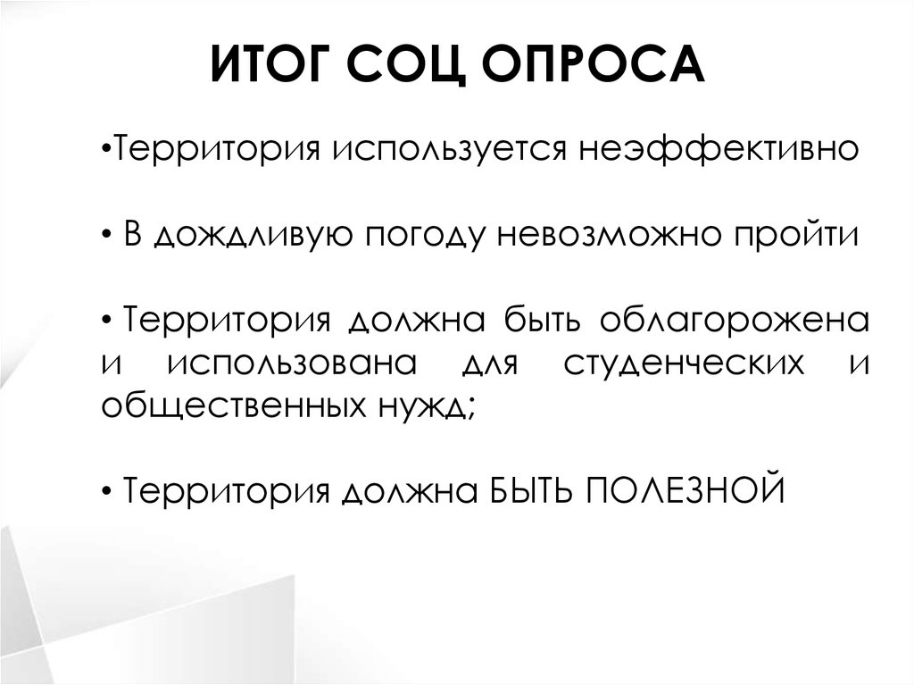 ИТОГ СОЦ ОПРОСА•Территория используется неэффективно