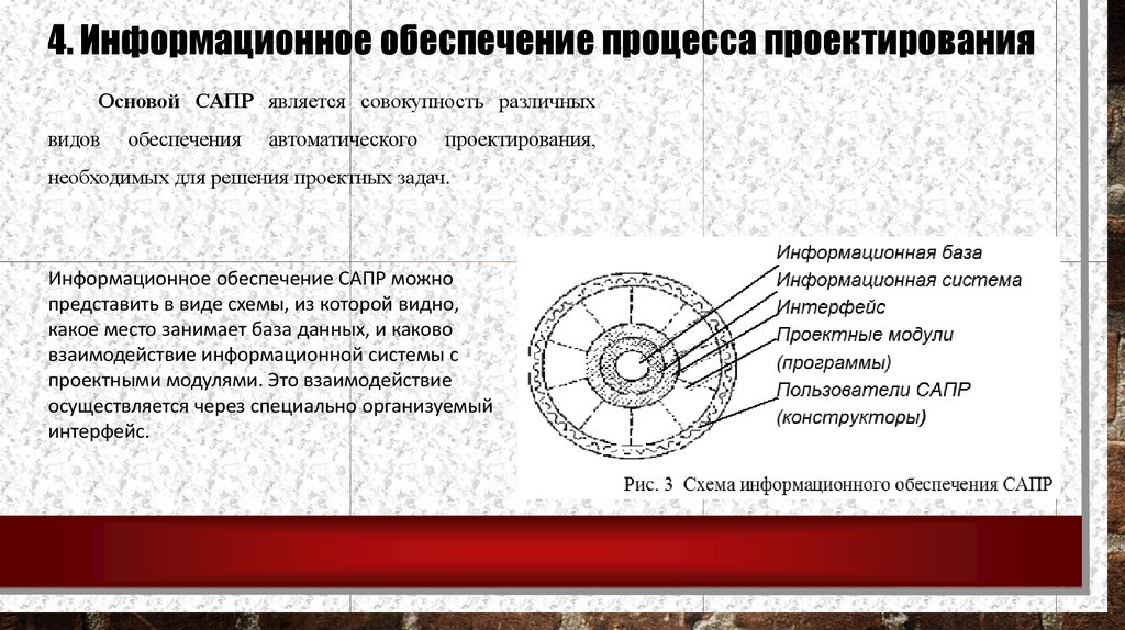 4. Информационное обеспечение процесса проектированияОсновой САПР является совокупность различных