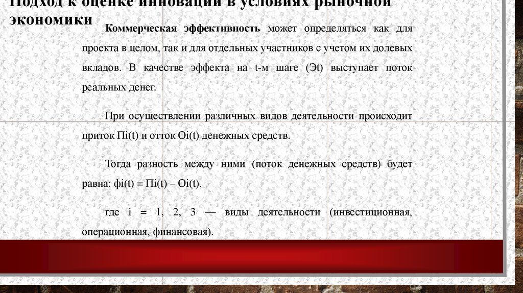 Подход к оценке инноваций в условиях рыночнойэкономики Коммерческая эффективность может определяться как для