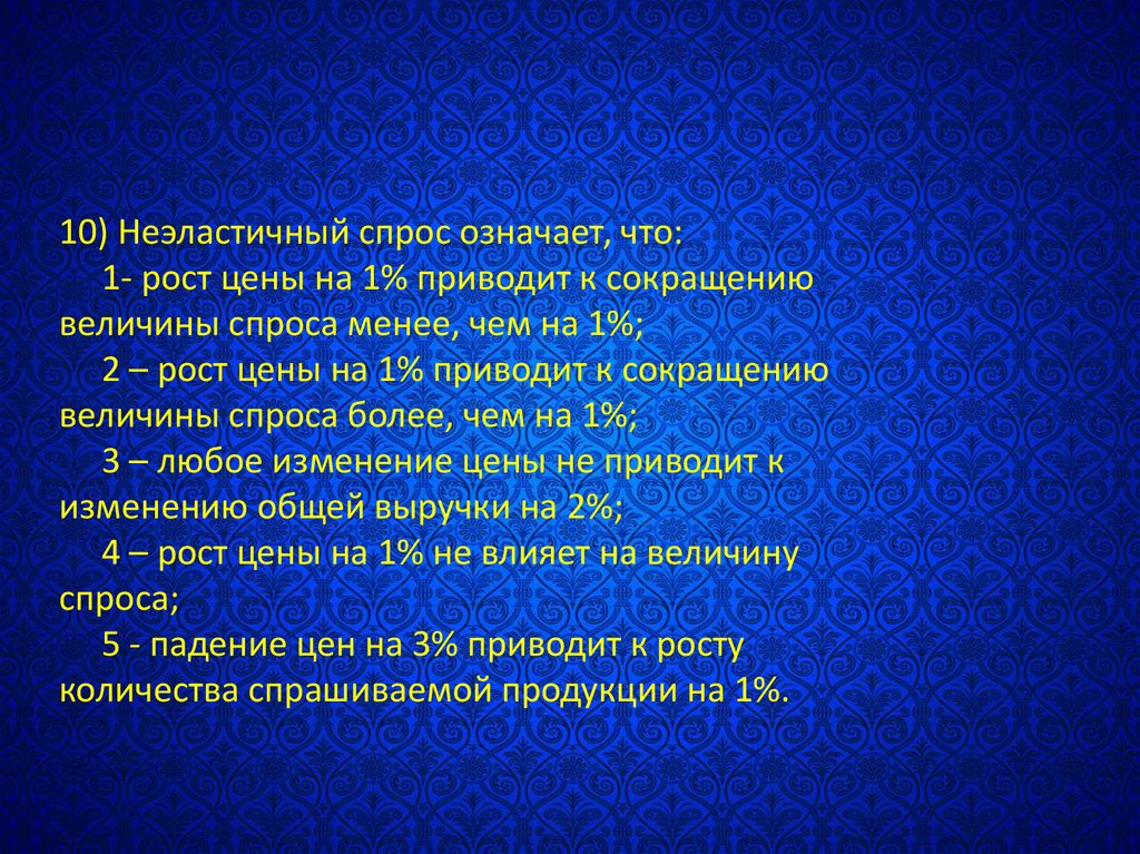 10) Неэластичный спрос означает, что:1- рост цены на 1% приводит к сокращению