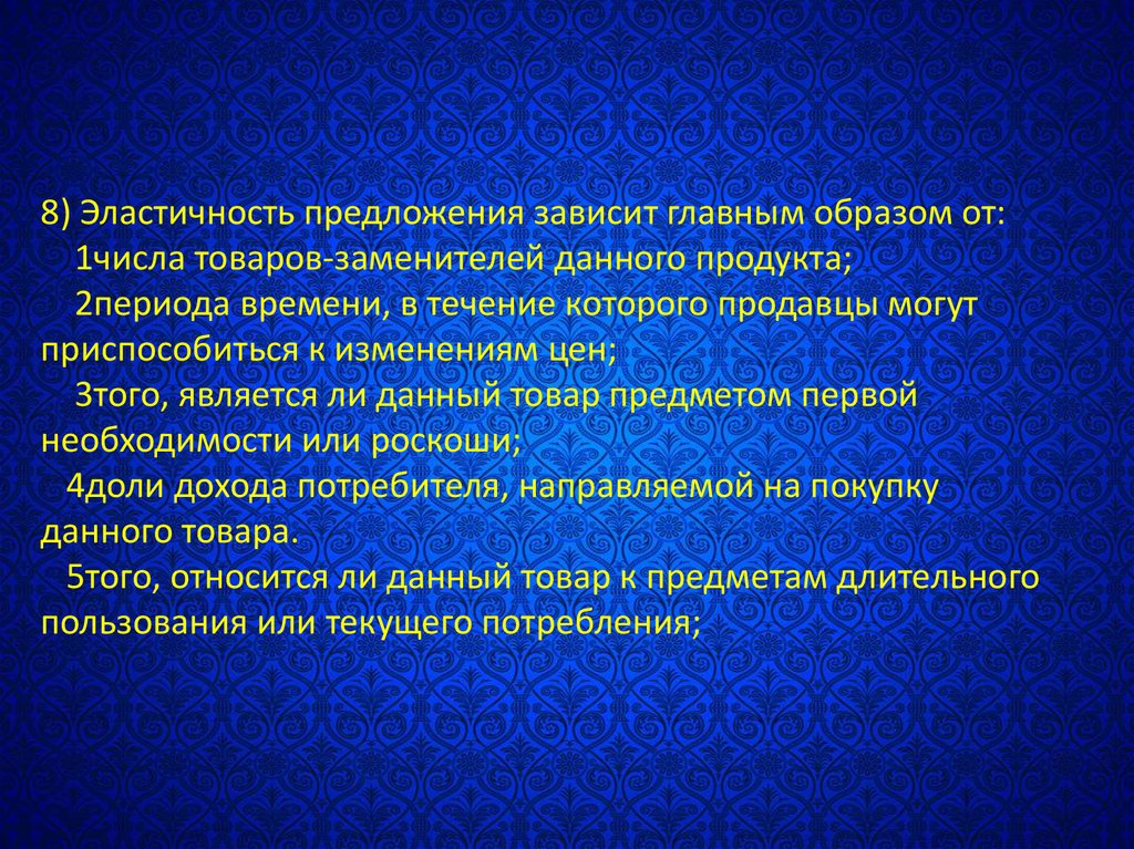 8) Эластичность предложения зависит главным образом от:1числа товаров-заменителей данного продукта;