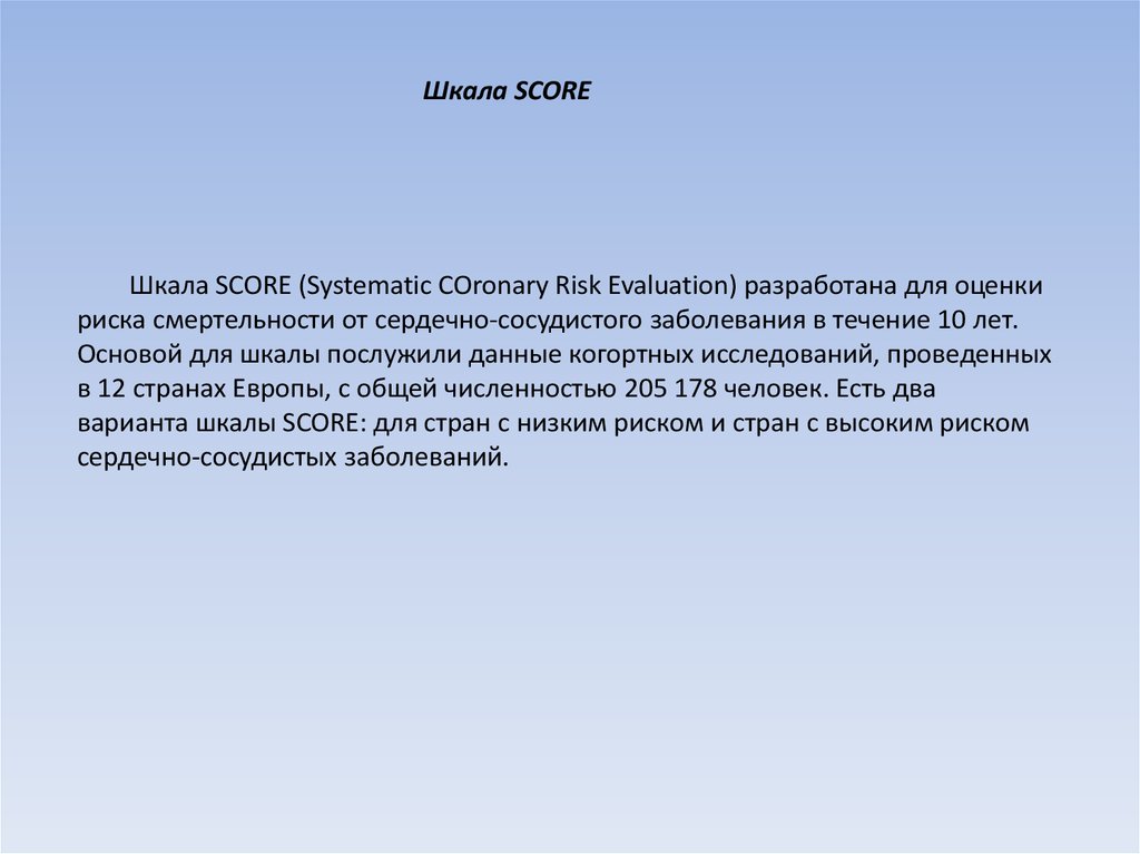 Шкала SCOREШкала SCORE (Systematic COronary Risk Evaluation) разработана для оценки