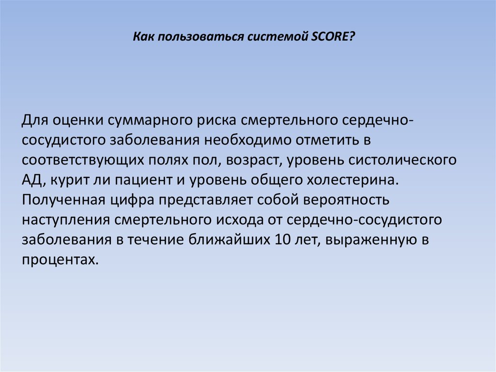 Как пользоваться системой SCORE?Для оценки суммарного риска смертельного сердечнососудистого заболевания необходимо отметить в