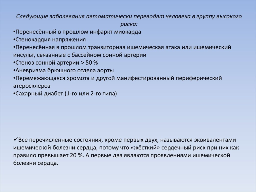 Следующие заболевания автоматически переводят человека в группу высокогориска: