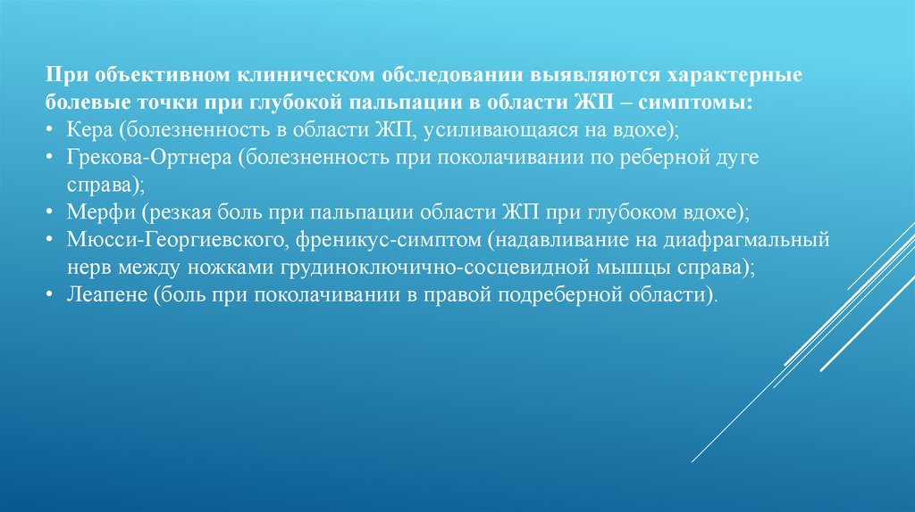 При объективном клиническом обследовании выявляются характерныеболевые точки при глубокой пальпации в области ЖП – симптомы: